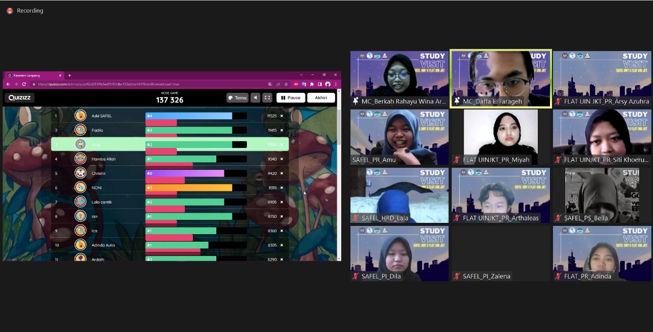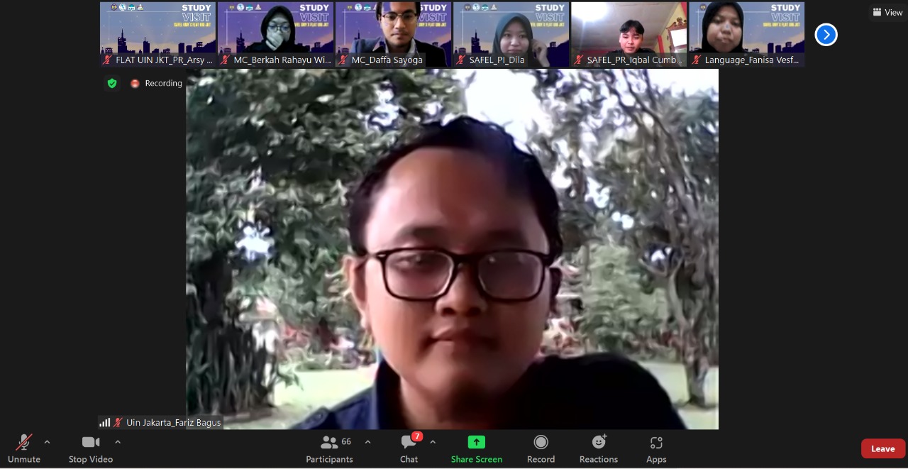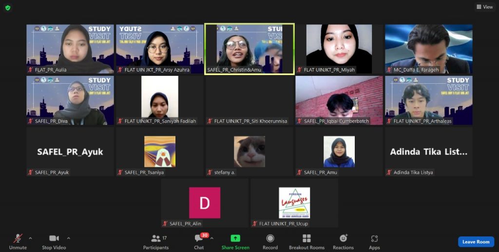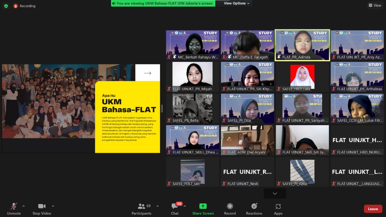 Due to the Covid-19 Pandemic, we could only welcome FLAT UIN’s visit via an online platform, which is Zoom Cloud Meeting. Despite that, we still managed to gain a lot of new information, new insights, and, most importantly, new friends. At the beginning of the event, we got to know more about each organization by seeing presentations done by our presidents. The presentation PowerPoint was so cool and it contained a lot of information about the departments, the staff, and the programs. The chat section was never empty. As the President explained their presentation, we had a fun chat to get to know them more.