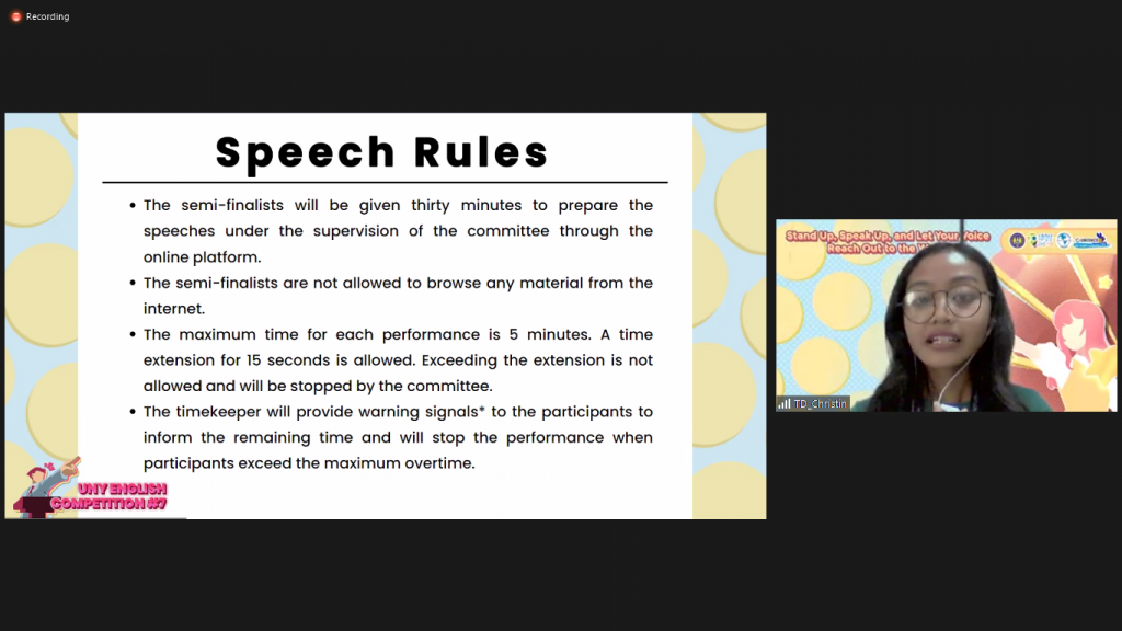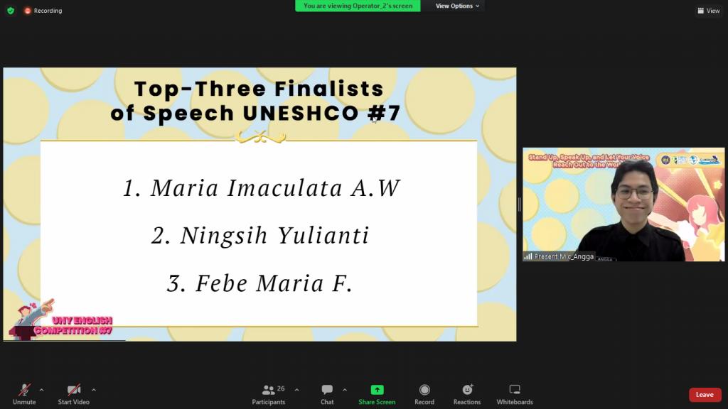 The results of the speech and micro-teaching competitions were announced during the closing ceremony of UNYFEST #10 on May, 28th, 2022. Via Zoom Meeting. The first winner of the speech competition was taken by Maria Imaculata A.W. from Sanata Dharma University, followed respectively as runners-up by Ningsih Yulianti from Siliwangi University, and Febe Maria F.N. from Bina Nusantara University. Following that, Qonita Labibah Rahmah from Yogyakarta State University was chosen as the favorite speaker. Meanwhile, in Micro-Teaching, the first winner was Apri Rahmanto from Yogyakarta State University, followed respectively as runners-up by Fikria Rozi from Yogyakarta State University, and Maria Niken Pangesti from Teknokrat University.