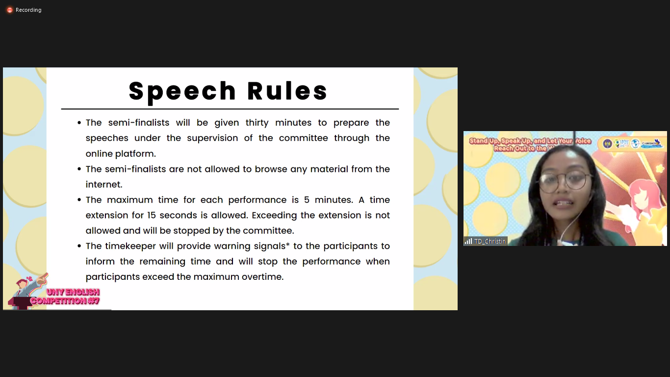 The results of the speech and micro-teaching competitions were announced during the closing ceremony of UNYFEST #10 on May, 28th, 2022. Via Zoom Meeting. The first winner of the speech competition was taken by Maria Imaculata A.W. from Sanata Dharma University, followed respectively as runners-up by Ningsih Yulianti from Siliwangi University, and Febe Maria F.N. from Bina Nusantara University. Following that, Qonita Labibah Rahmah from Yogyakarta State University was chosen as the favorite speaker. Meanwhile, in Micro-Teaching, the first winner was Apri Rahmanto from Yogyakarta State University, followed respectively as runners-up by Fikria Rozi from Yogyakarta State University, and Maria Niken Pangesti from Teknokrat University.